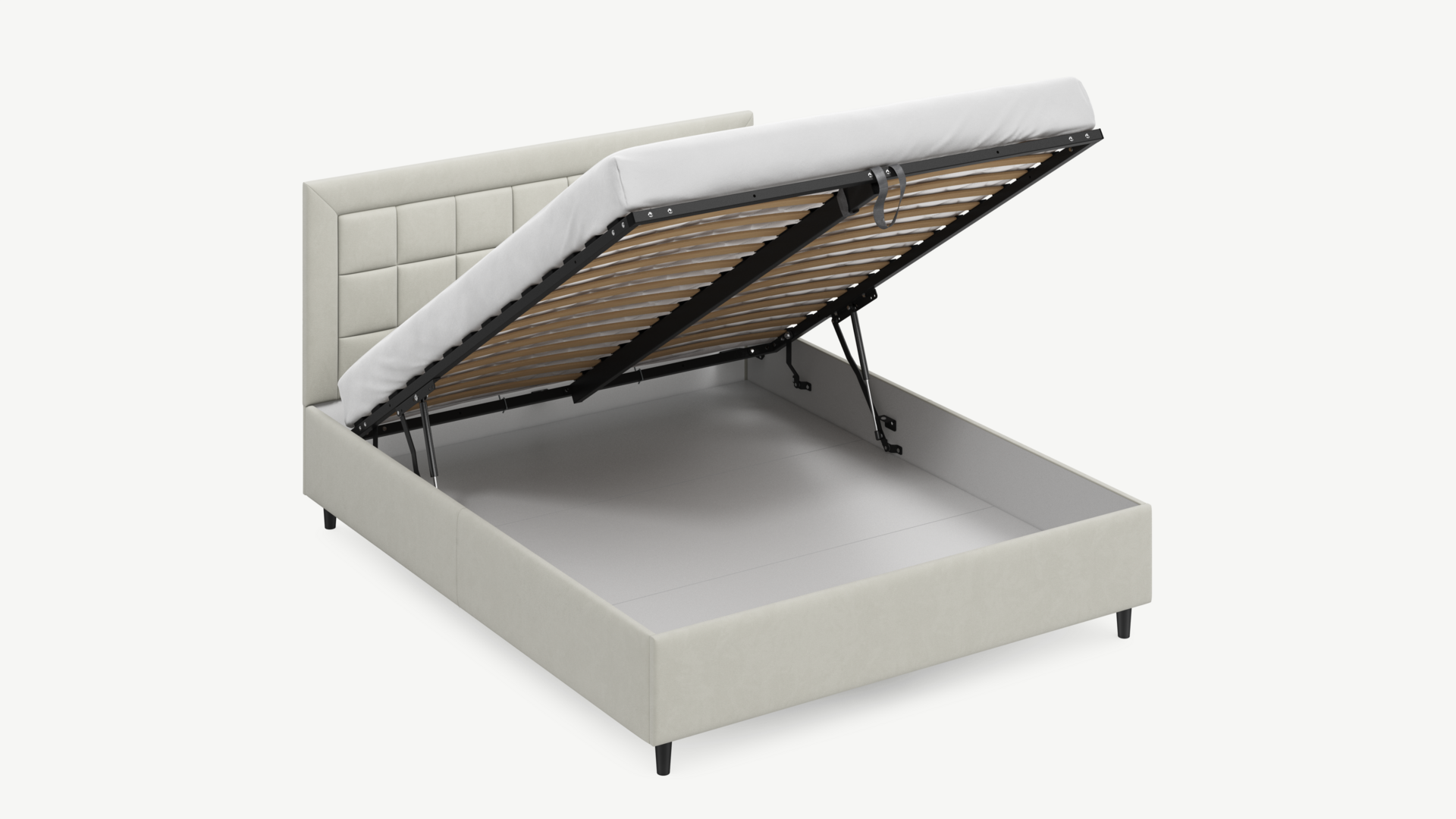 Вместительная емкость под кроватью без внутренних перегородок позволяет использовать для хранения вещей 100% пространства.