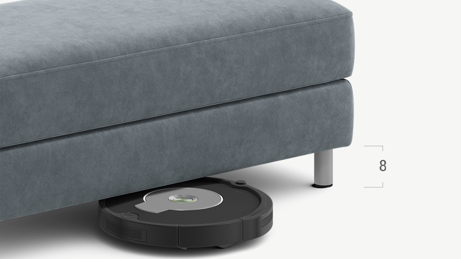 Под банкеткой с высокими цилиндрическими опорами проходит робот-пылесос.