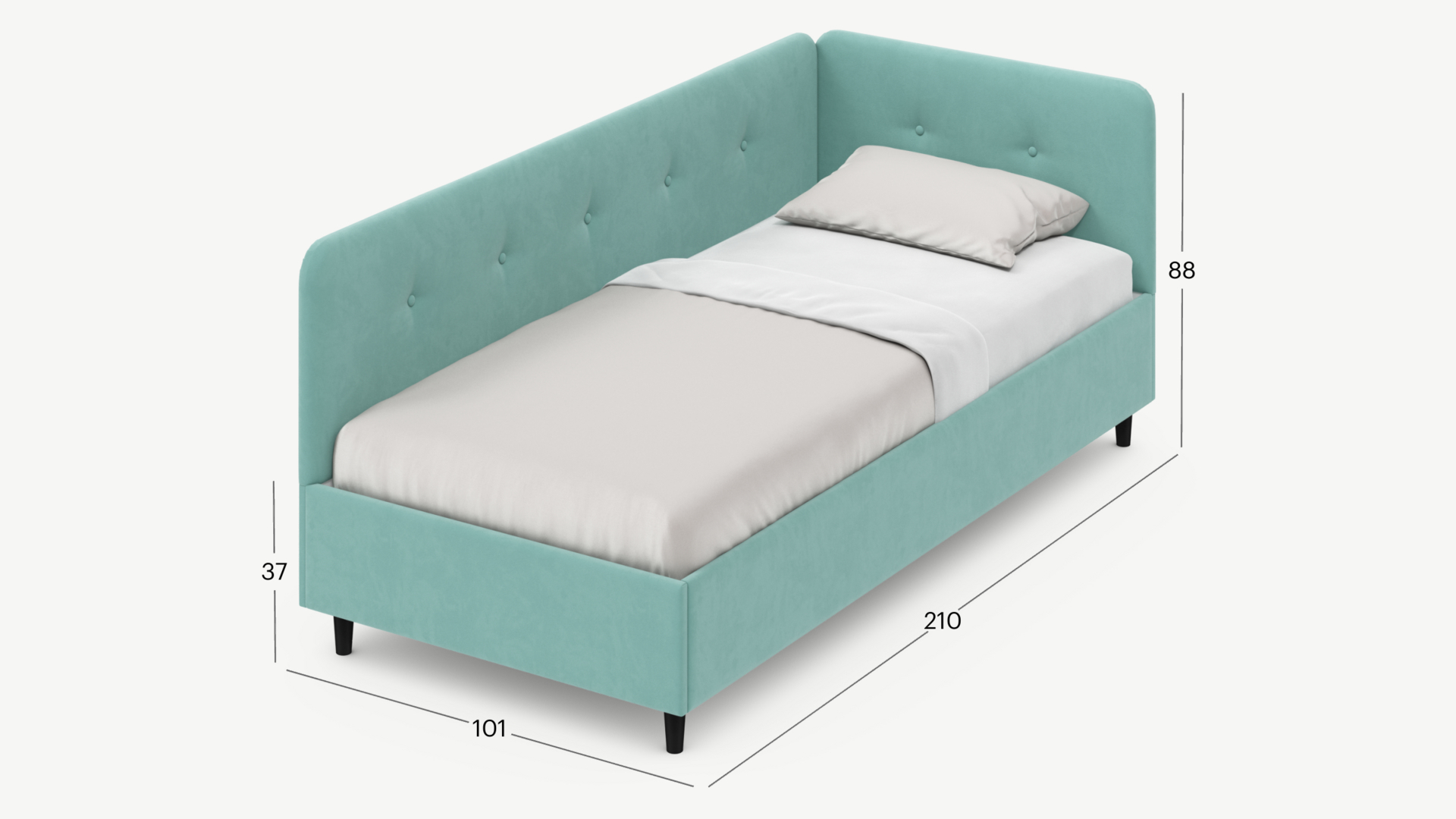 Угловая односпальная кровать MOON FAMILY 1253 с мягкой спинкой и изголовьем обладает округлыми формами, привносящими в интерьер нотки нежности. Изголовье, украшенное пуговицами, добавляет окружающему пространству шарм и уют. Высокие опоры придают кровати визуальной легкости, а также обеспечивают удобство во время уборки.