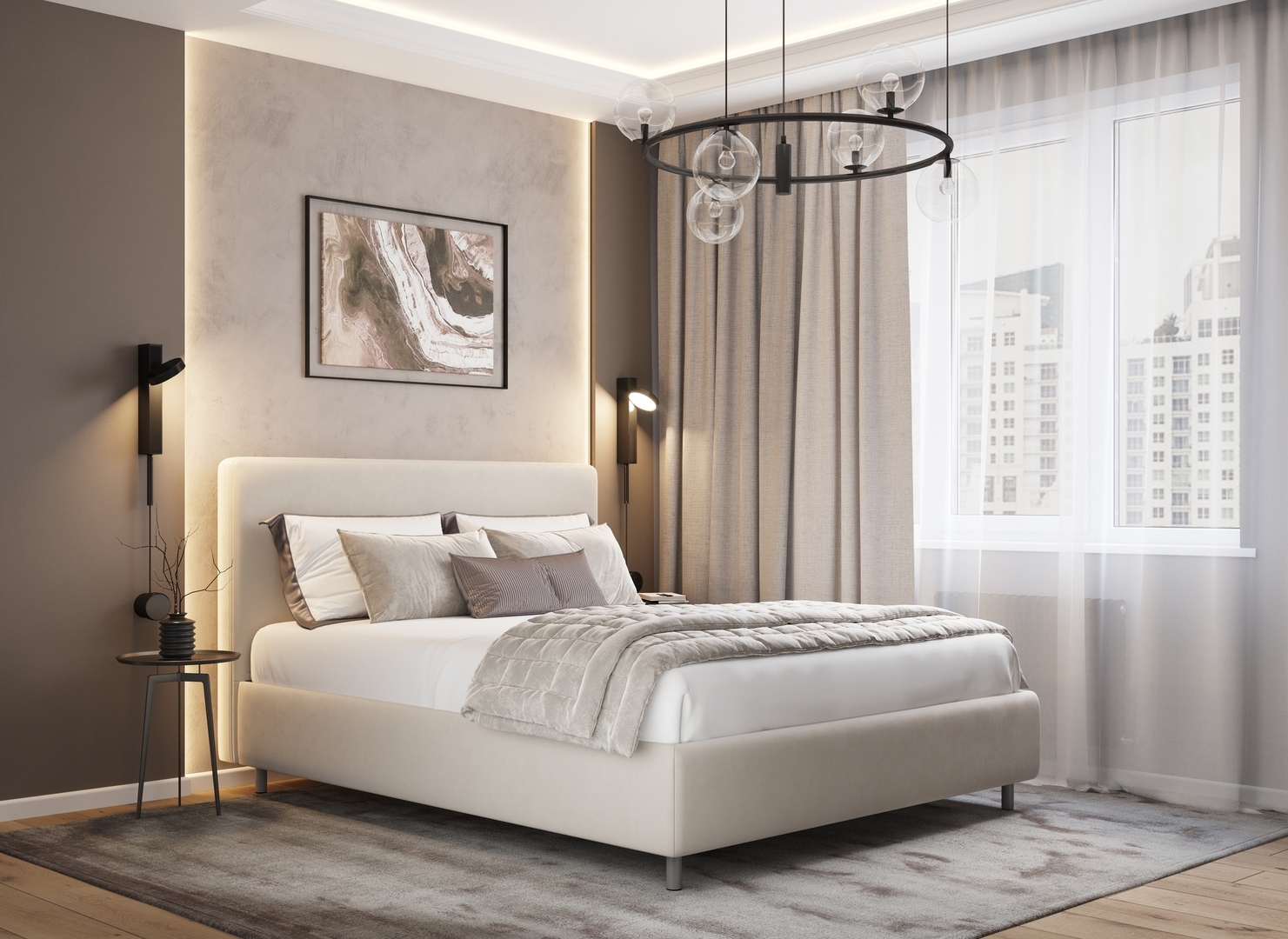 Творческий подход к выбору обивочного материала меняет образ дизайна. Велюр за счет своей бархатистой фактуры привносит в пространство шика и утонченности. Шенилл дополняет оформление спальни природными текстурами, создавая атмосферу тепла и уюта.